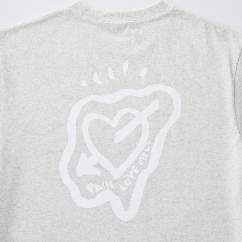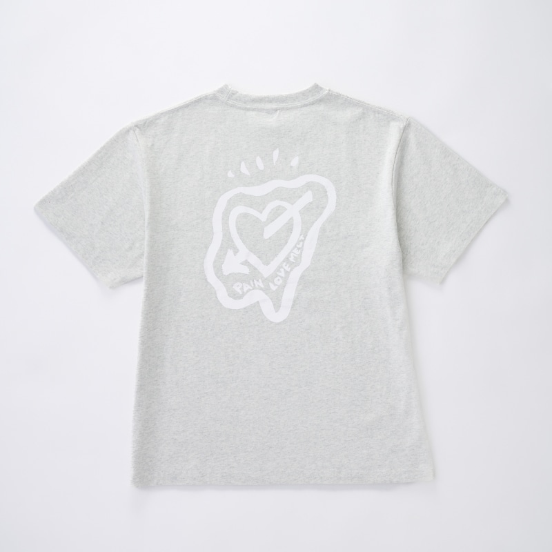 バックに大きくハートのモチーフがプリントされたショートスリーブTシャツ。